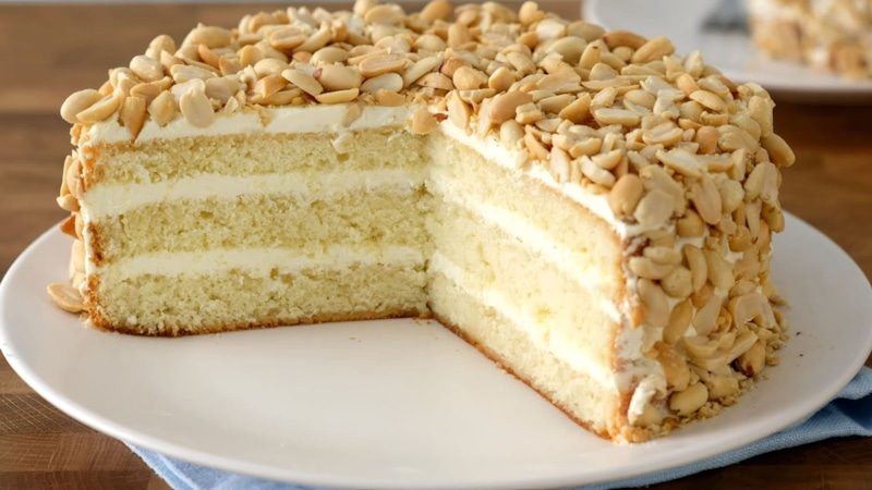Торт посыпают 170 г дробленого жареного арахиса, предварительно очищенного от шелухи, и 15 г сахарной пудры.