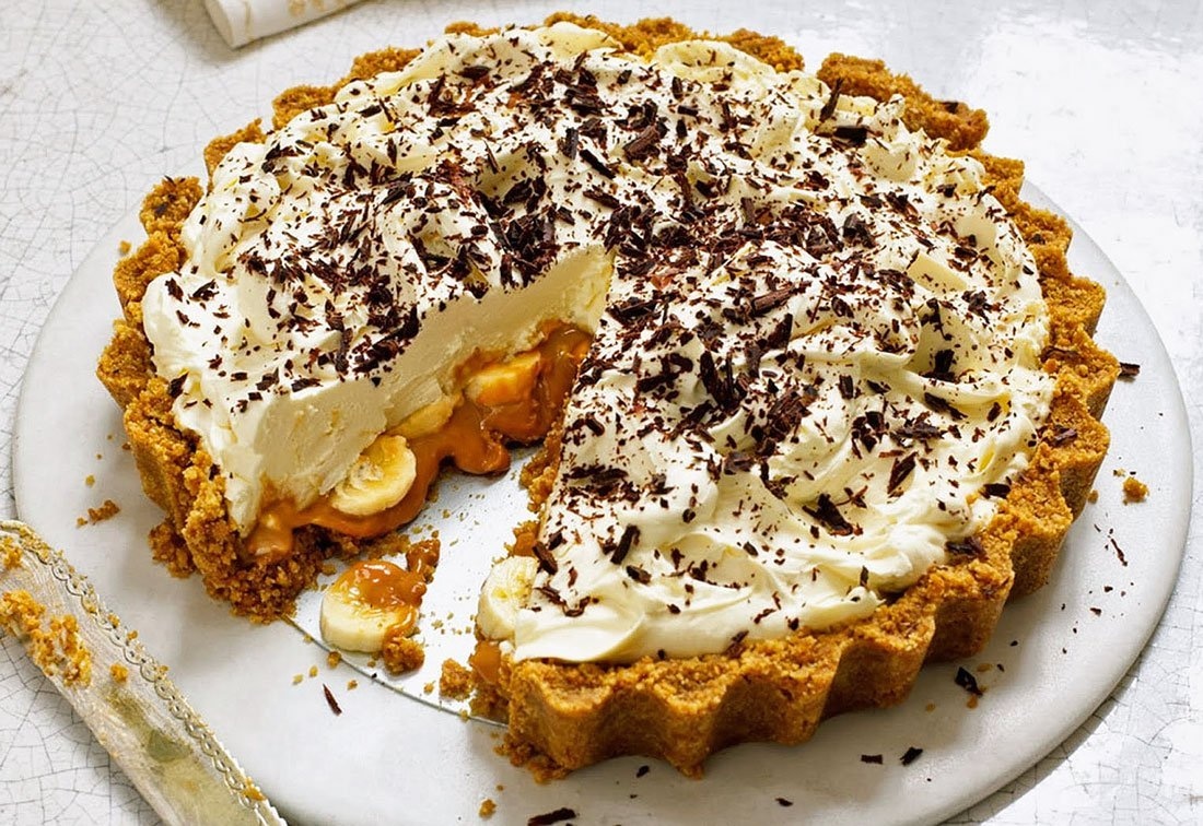 Название этого пирога, баноффи, состоит из двух слов – банан и тоффи, т. е. ириска. Основа варьируется. Можно использовать раскрошенное печенье или песочное тесто. Покрытие – взбитые сливки.
