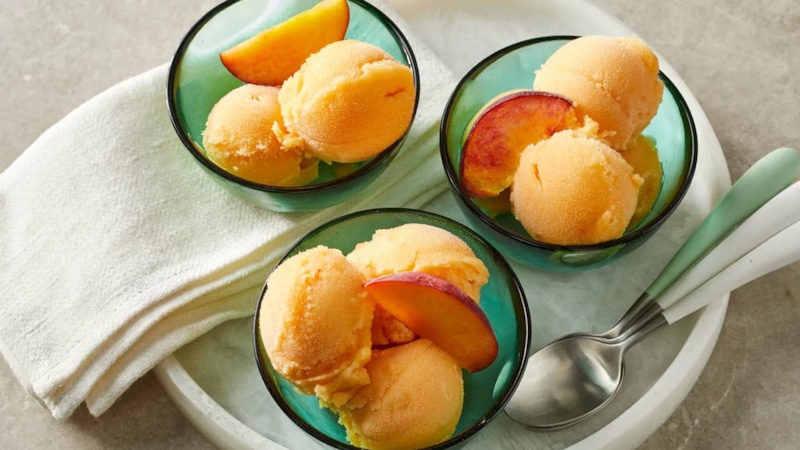 Перед подачей сорбет перекладывают в креманки, используя для этого специальную ложку. Это ароматное мороженое буквально тает во рту, рождая самые приятные ощущения. Летом такой десерт придется как нельзя кстати, особенно в сезон персиков.