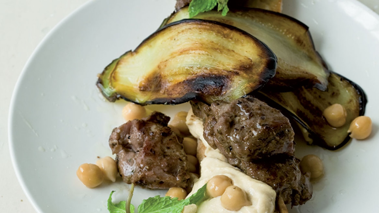 Разогрейте гриль на высокой мощности. Нанижите на шампуры мясо и обжарьте до золотистого цвета (по 3 минуты с каждой стороны).