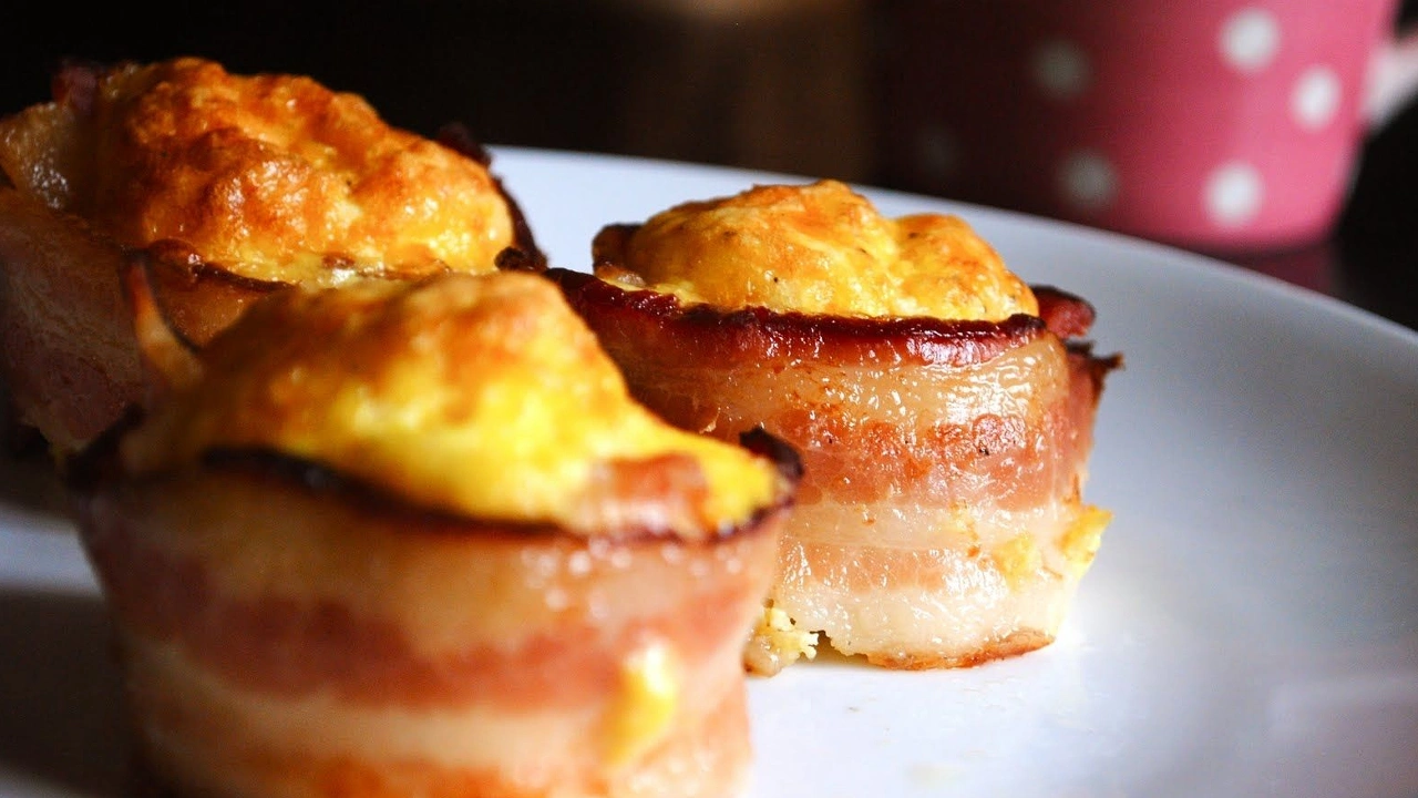 Наполните углубления сырной смесью, слегка уплотняя. Сверху выложите по 2–3 кольца лука в беконе.
