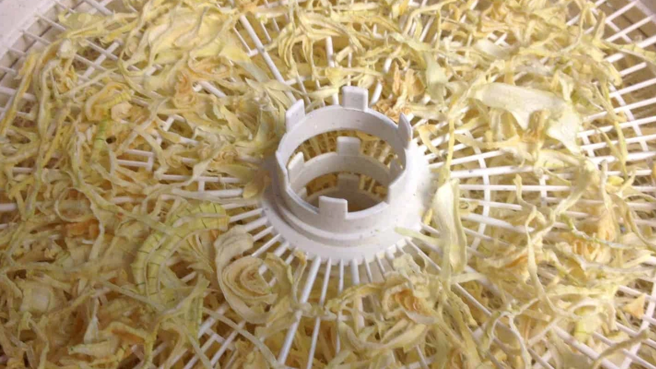 Установите дегидратор на температуру 52–57 °C. Сушите 6–10 часов. Точное время зависит от влажности лука, влажности окружающей среды и модели дегидратора. Периодически поворачивайте лотки (например, каждые 2–3 часа) для равномерной сушки.