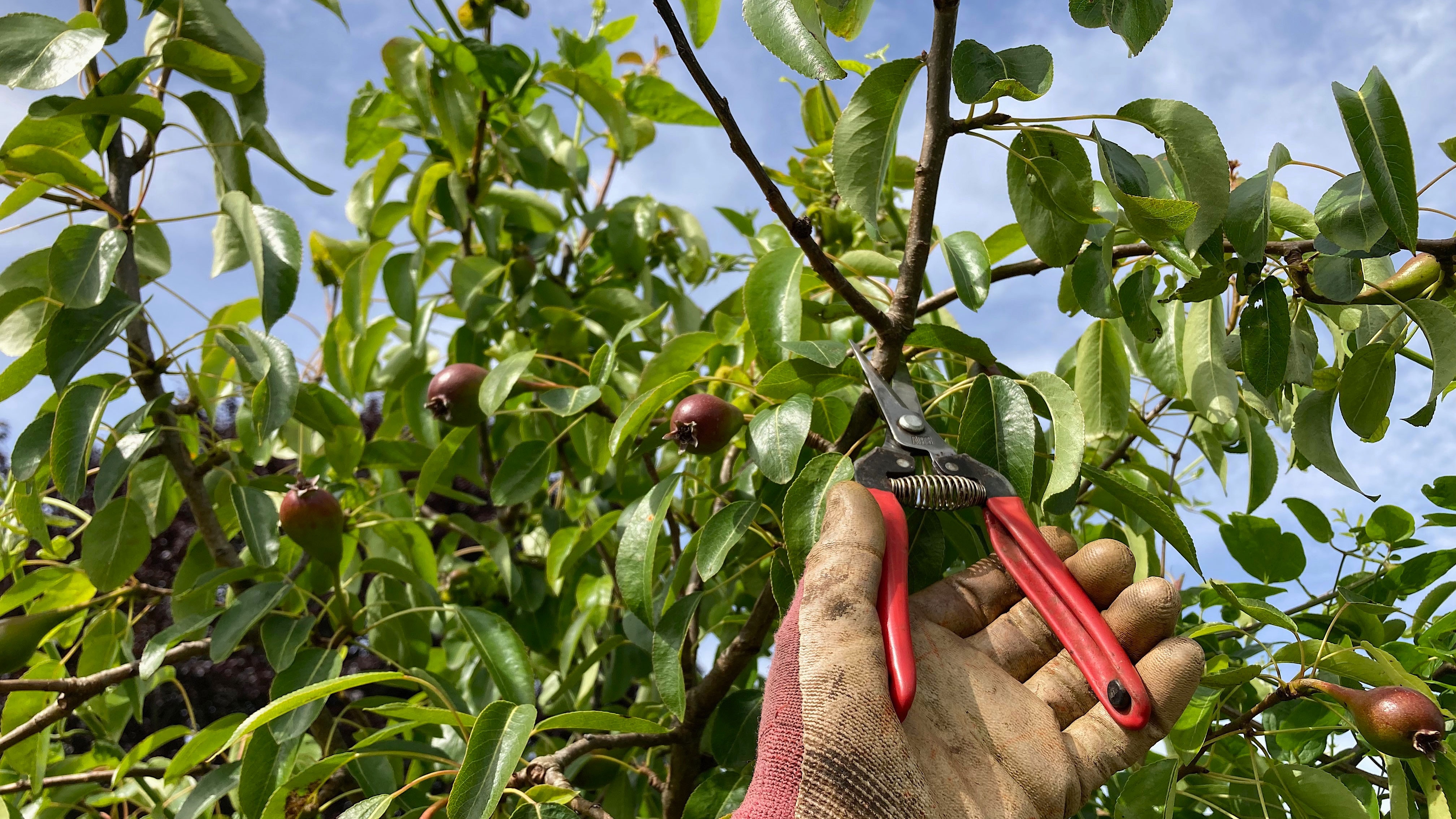 Груша тоже склонна к загущению, поэтому у нее убирают лишние отростки и растущие вертикально вверх волчки. В итоге дерево развивается равномерно и не ломается.