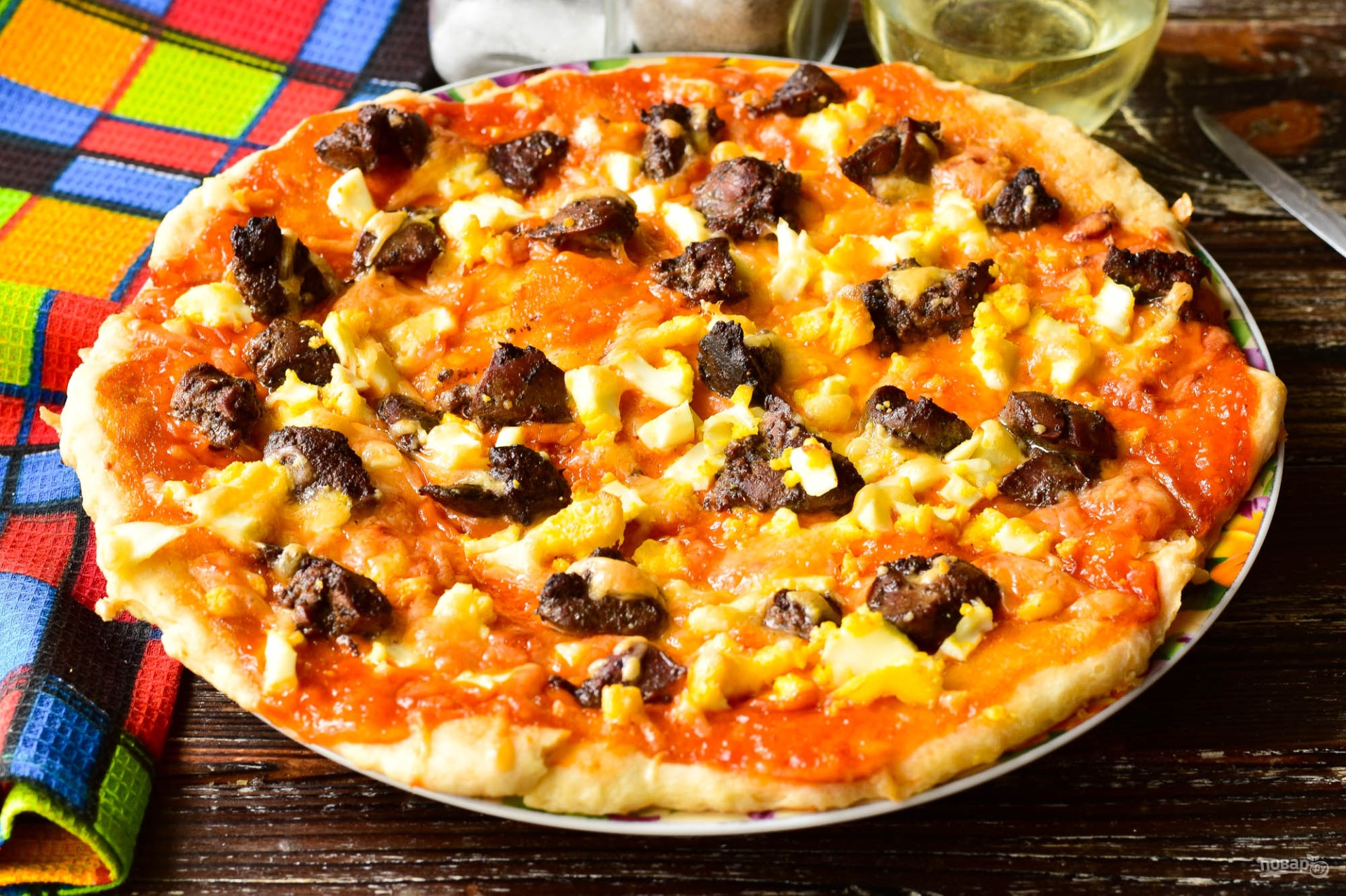Сытная, сочная и вкусная пицца с куриной печенью — это любопытный вариант известного всюду угощения с необычным наполнением.