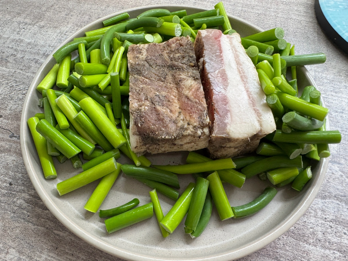 Побеги промывают под краном, обсушивают, избавляют от бутонов и разделяют при помощи ножа на небольшие фрагменты, чтобы помещались в чашу мясорубки. Сало избавляют от шкурки, нарезают произвольными кусочками.