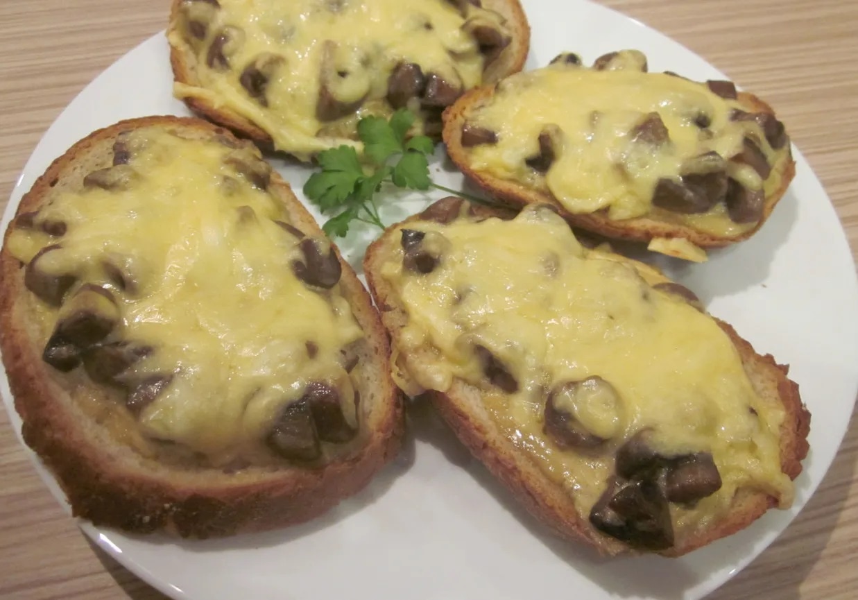 Разрежьте батон на кусочки по количеству едоков. Слегка смажьте внутреннюю часть ломтиков любой приправой (например, горчицей). Поместите на хлеб ломтик сыра (грюйер, чеддер). Выложите сверху грибы и салями. Покройте еще одним ломтиком сыра.