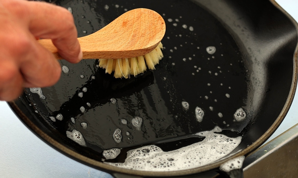 Сковороду помещают на плиту и доводят раствор до кипения. Прогревать его следует на небольшом огне в течение нескольких минут. Затем жидкость нужно слить, а посуду тщательно промыть прохладной водой с обычным средством для мытья.