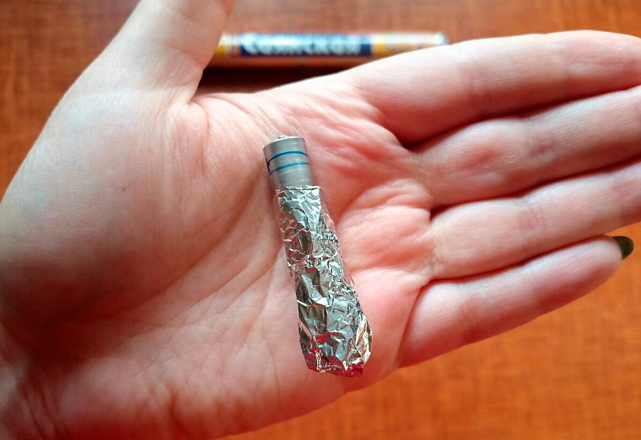 Понадобится стандартная батарейка формата АА, а также пищевая фольга для запекания. От последней отрезают небольшой фрагмент и оборачивают элемент питания со всех сторон. Главное — проследить, чтобы материал плотно прилегал к обоим полюсам и замыкал их.