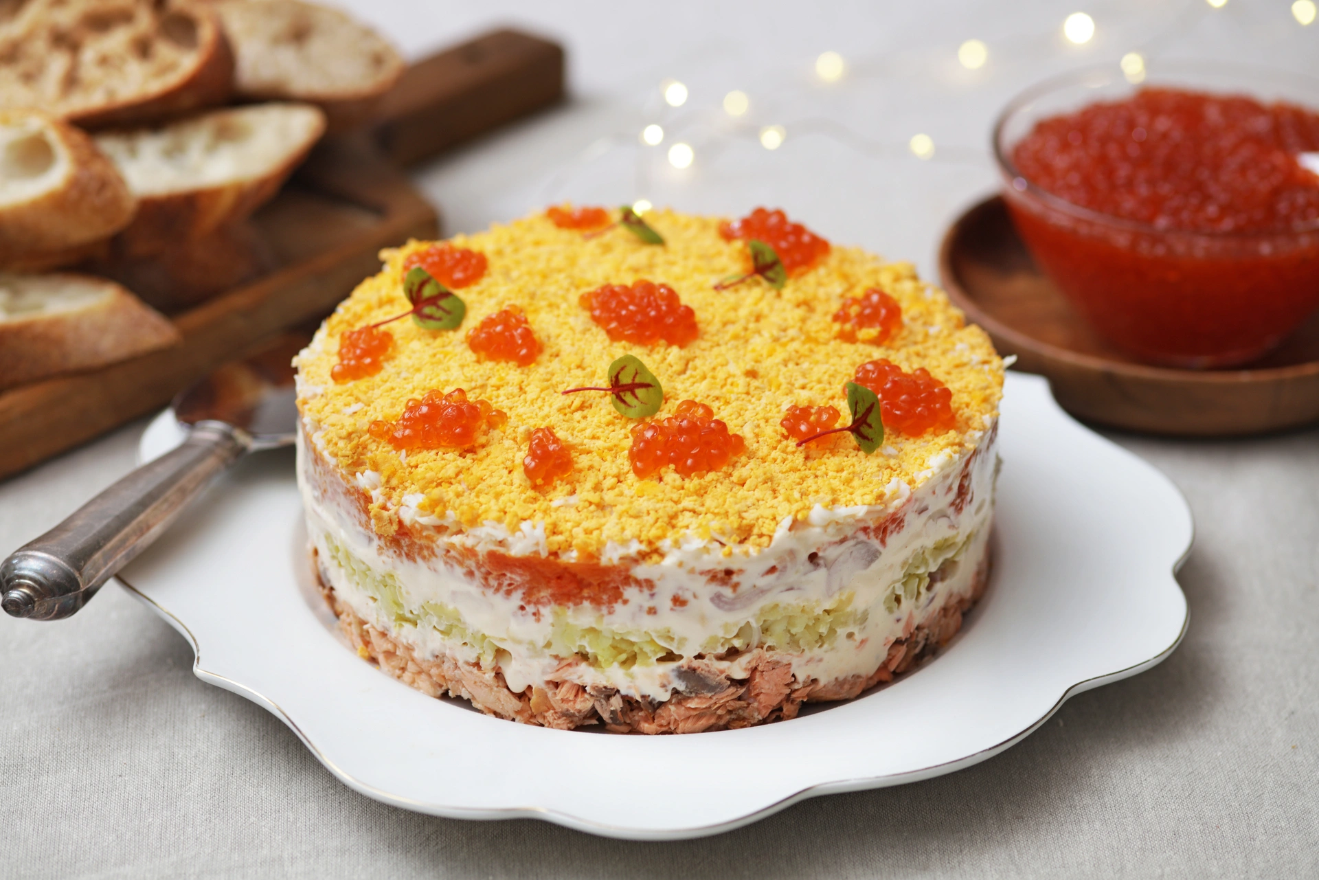 Слоеный салат с форелью — любопытное угощение, которым стоит разнообразить застолье на Новый год.