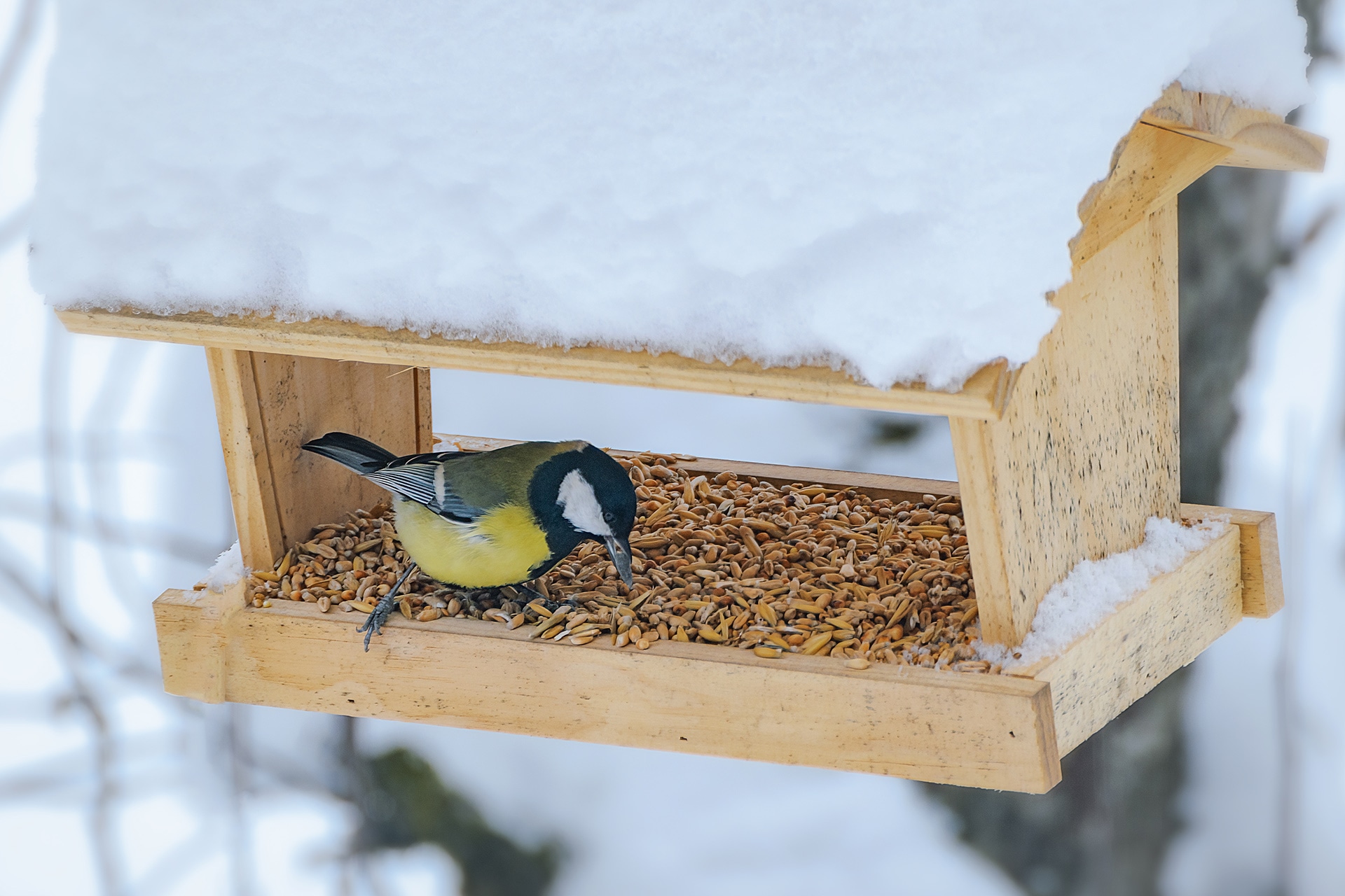 Корм в нее необходимо подсыпать регулярно. Лучше всего для этих целей подходят сырые семечки, необработанное зерно, сушеные ягоды и фрукты, несоленое сало.