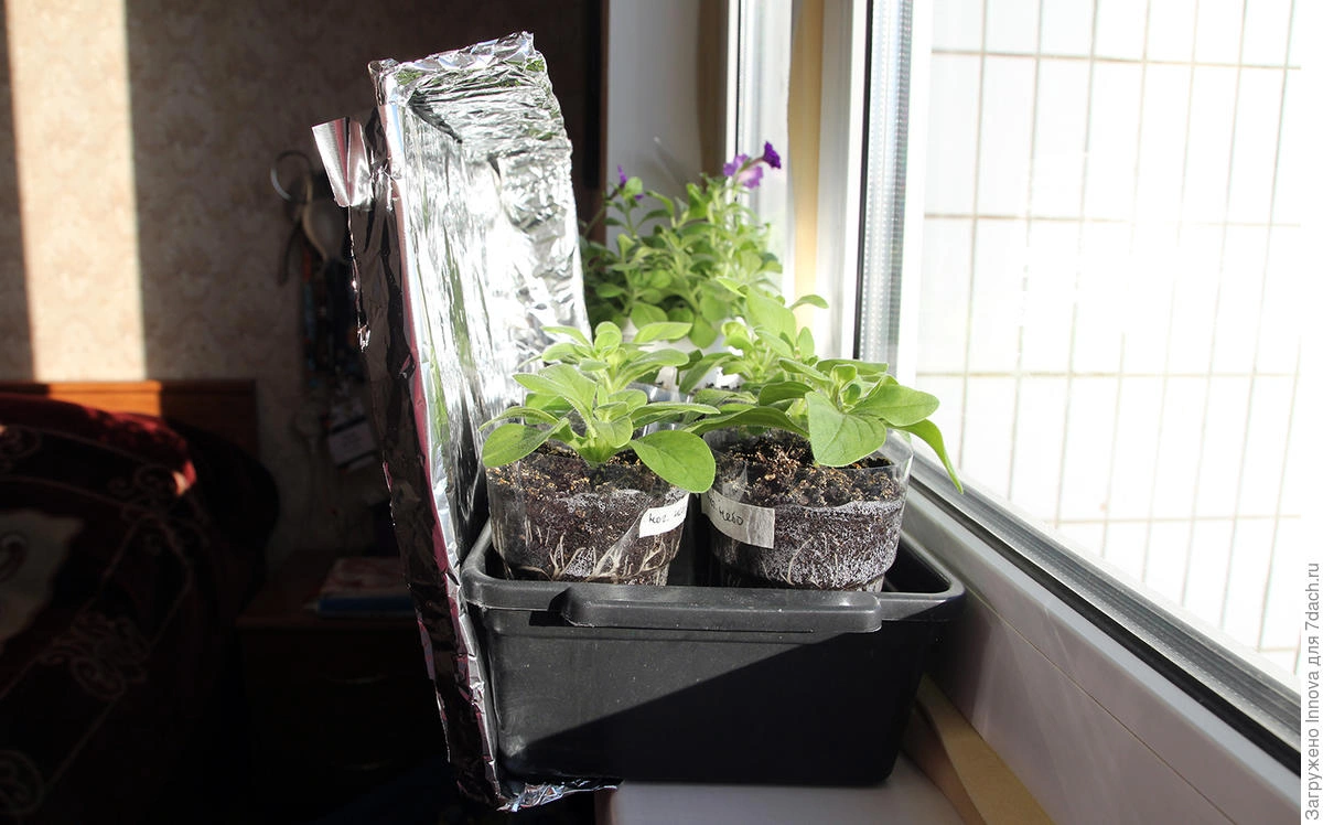 Рассада не будет слабеть и вытягиваться, если поставить досветку. Но подключение фитоламп доступно не каждому — в этом случае выручит копеечная пищевая фольга.