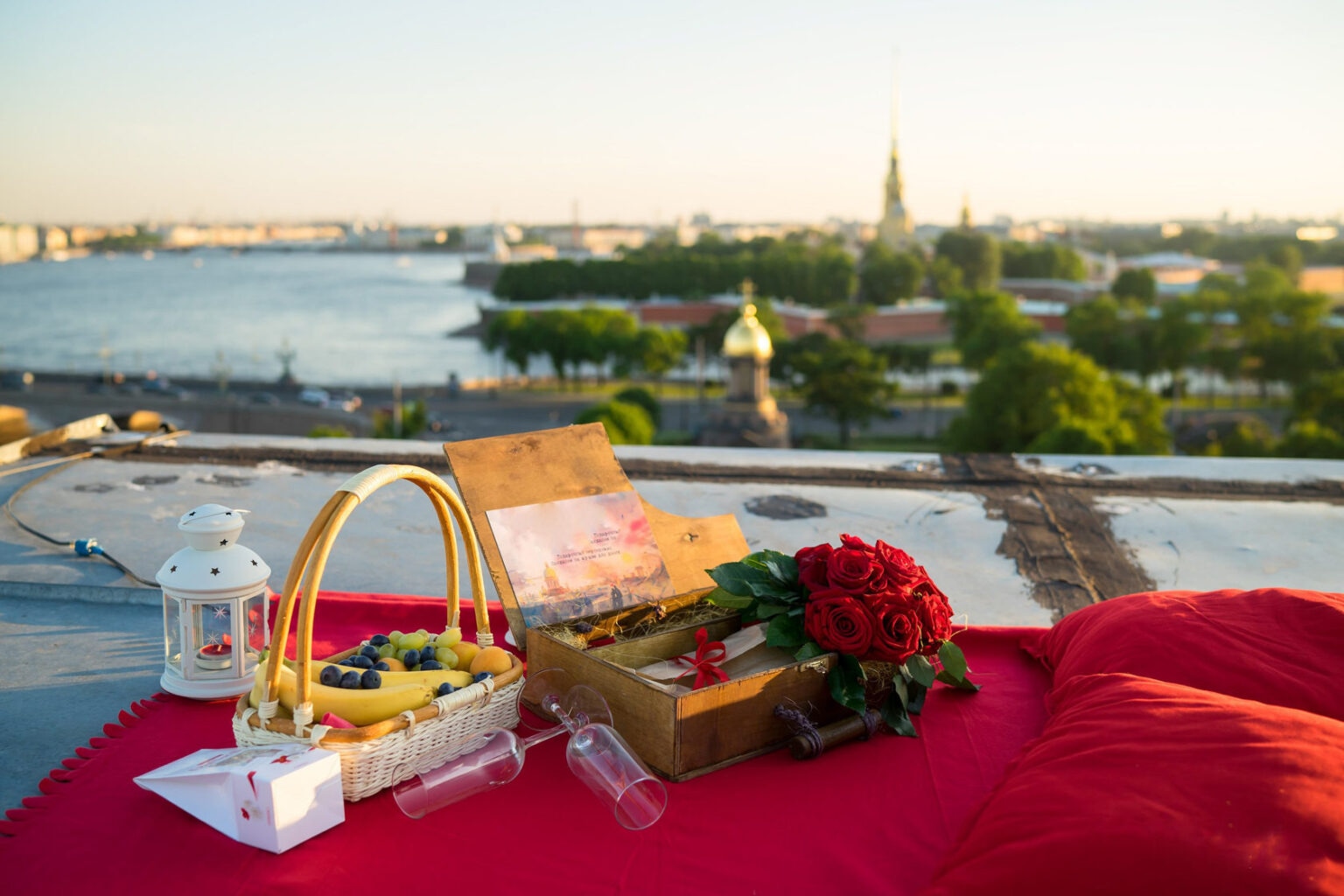 Если в городе вашего проживания есть терраса с красивым видом, то в этот вечер она может послужить местом для романтической встречи. Главное – заранее все продумать: принести стулья или подушки для сиденья, взять с собой теплые пледы, подвесные фонарики и легкие закуски, чтобы с комфортом поужинать под звездами.