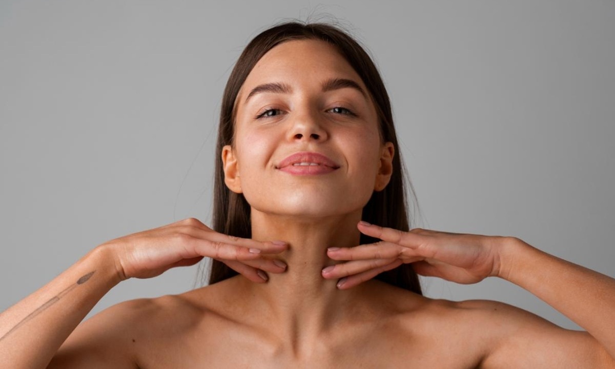 Разогрейте ладони, потерев их друг о друга. Подушечками пальцев аккуратно ведите снизу вверх – от ключиц к подбородку, словно разглаживая кожу. Хватит 10 плавных повторов.