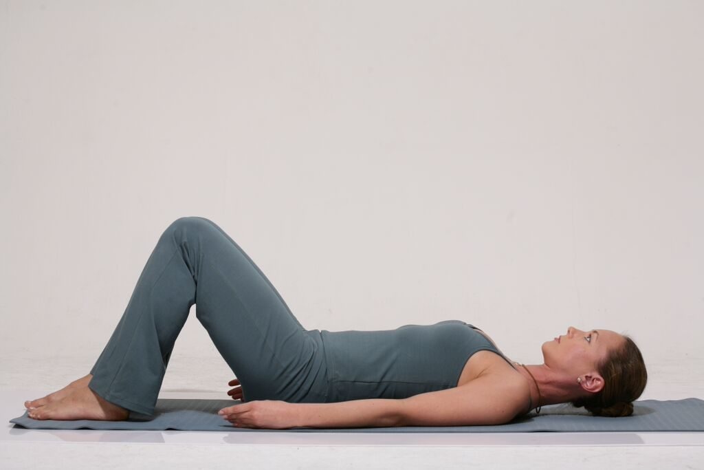 Для начала ложатся на спину и вытягивают руки вдоль тела. Ноги при этом сгибают в коленях так, чтобы ступни лежали на матрасе.