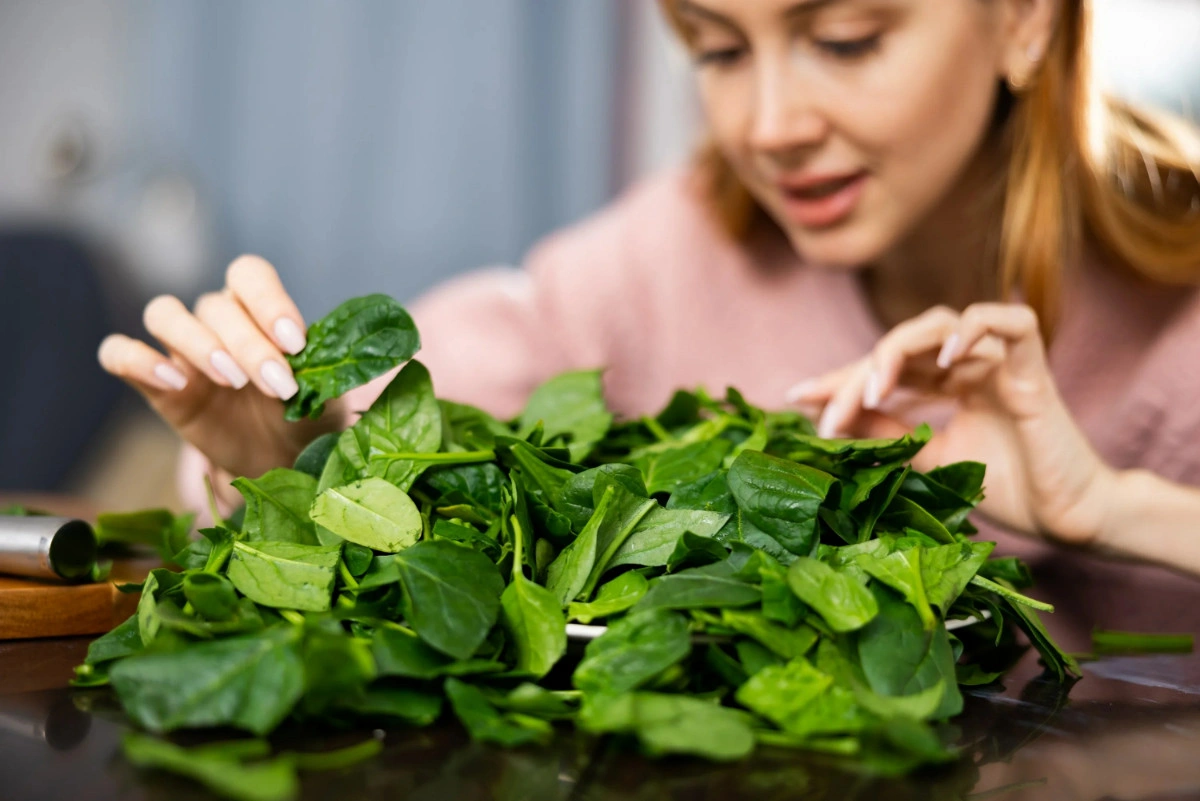 - шпинат — помимо клетчатки, содержит железо, магний, кальций, а также витамины, при этом в 100 г не более 30 ккал;