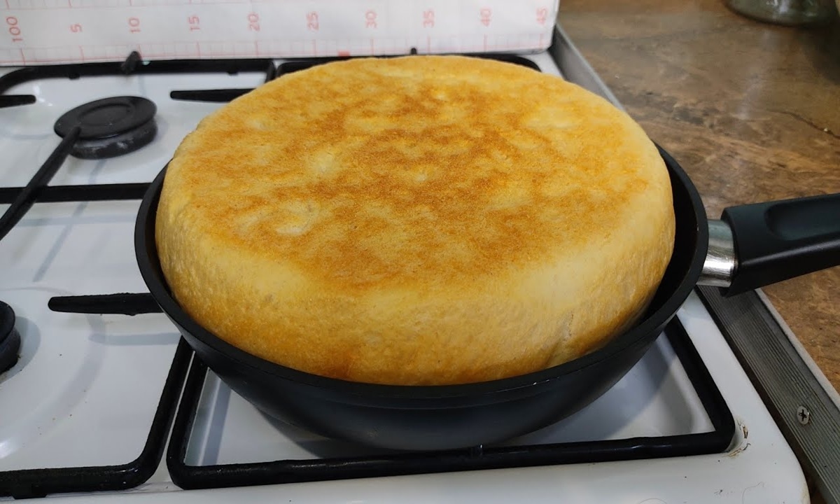 На сильном огне лепешка моментально покрывается золотистыми пузырьками. Затем огонь убавляется, сковорода накрывается крышкой. Пар делает мякиш влажным и пористым. Через 5 минут изделие переворачивается и доходит до готовности еще 3 минуты под крышкой.