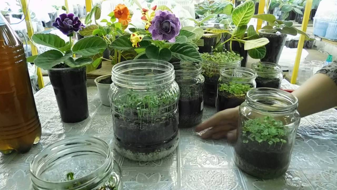 На дно каждого сосуда укладывают дренаж в виде керамзита, затем заполняют банку на ⅓ почвой и аккуратно пересаживают растения, заглубляя до семядольных листьев. Поливают и ставят в светлое место.