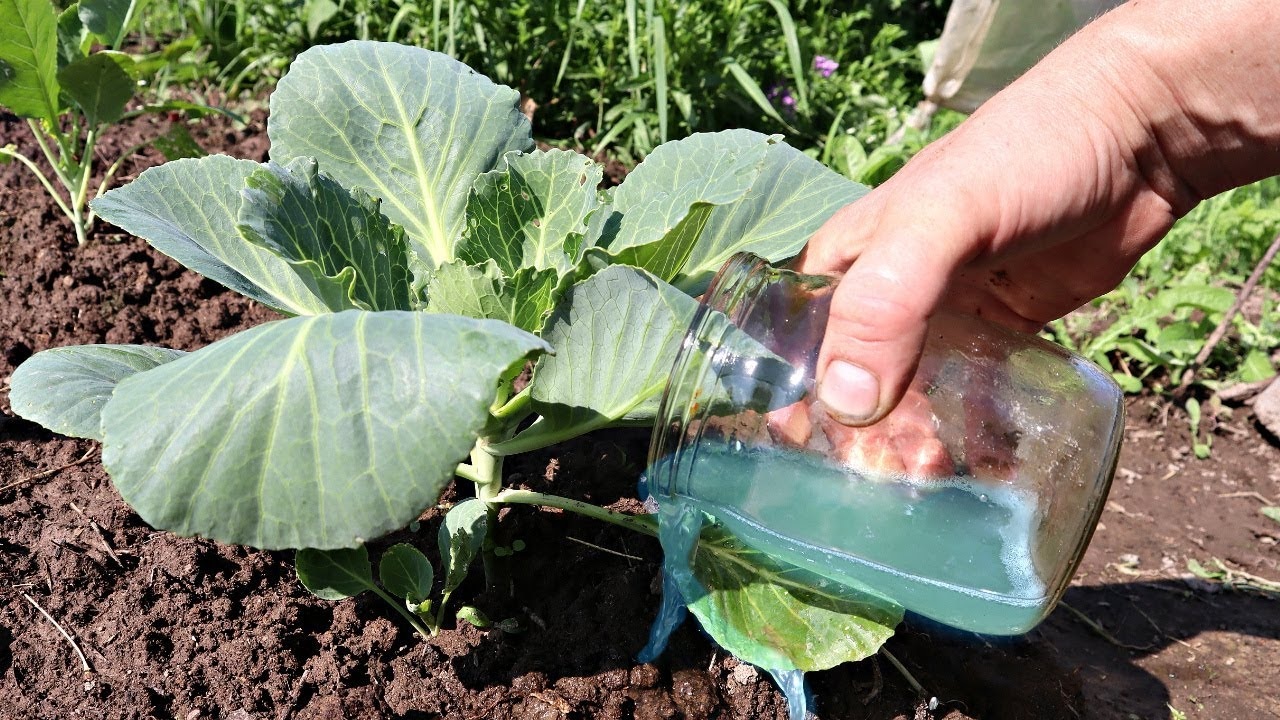 Еще один самодельный раствор, заставляющий кочаны вырастать большими, сочными и здоровыми, готовят из марганцовки. Берут 1 ч. л. с горкой и размешивают в 2 л воды. Получается концентрат, который понадобится разбавить в 5-литровом ведре. Капусту поливают этим средством так, чтобы на каждое растение приходилось до 500 мл.