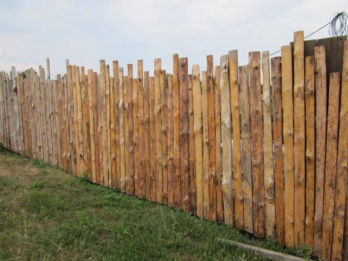 Из древесины выгоднее воспользоваться горбылем, цена на который раза в 4 меньше, чем на обрезную доску. Только понадобится самостоятельно очистить округлую сторону от коры. При монтаже верхний край намеренно стоит оставить неровным — так он выглядит лучше.