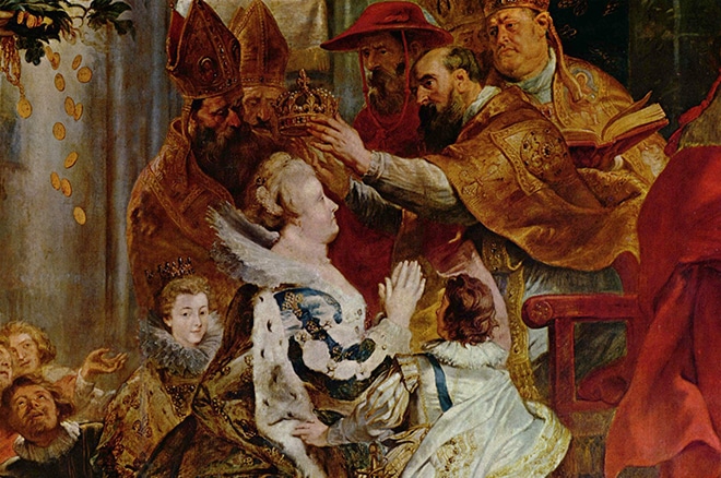 13 мая 1610 года в Сен-Дени Марию коронуют. Беспокойство Генриха о возможных болезнях и опасностях военного похода оказывается напрасным. Через день после торжества, 14 мая 1610 года, король погибает от кинжала Равальяка. Подозрение в соучастии, павшее на фаворитов королевы, не было ни доказано, ни опровергнуто.