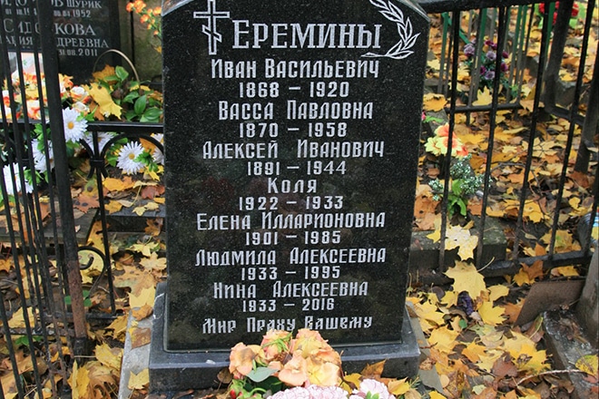 Похороны Нины Алексеевны прошли на Пятницком кладбище. Советскую чемпионку похоронили в могиле рядом с ее родственниками, в частности с любимой сестрой Людмилой, о которой спортсменка всегда тепло говорила в интервью, подчеркивая тесную связь (даже когда в школе их развели по разным классам, девочки делали в контрольных работах одинаковые ошибки). Также здесь нашел последний приют брат Ереминой Коля, который умер еще до рождения близняшек, попав под машину.