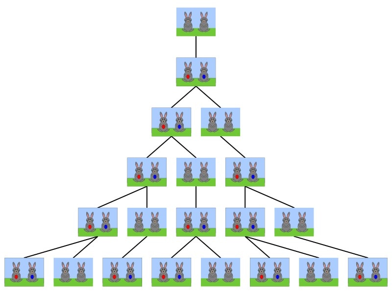 В «Книге абака» говорится также о знаменитой последовательности чисел Фибоначчи. В ней первые два числа равны 0 и 1, а каждое последующее число представляет собой сумму двух предшествующих. Итальянский ученый продемонстрировал, как работает этот алгоритм, на примере задачи о кроликах: если в загон поместить пару зверьков, которые ежемесячно станут приносить еще одну пару, то сколько пар окажется в загоне спустя двенадцать месяцев?