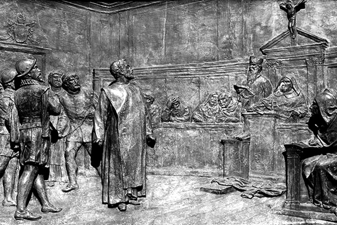 Ряд биографов говорит о том, что казнь Джордано Бруно стала результатом не столько борьбы с наукой и просвещением, сколько борьбы за власть. Бруно был невероятно убедителен в своих учениях, а основные идеи его заключались в отвержении религии как таковой, что было довольно опасным вольнодумием в эпоху средневековья. Арестовали Бруно после доноса некоего Мочениго, обвинившего философа в ереси. Судебный процесс длился шесть лет, которые философ провел в заточении в римской тюрьме.