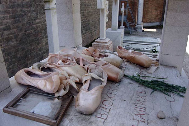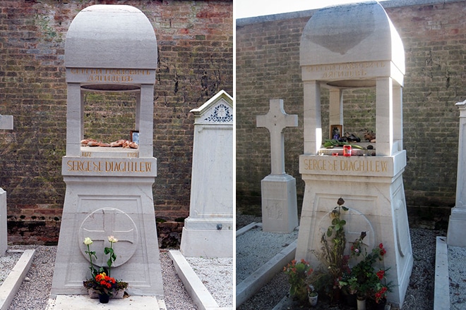 Так как у Дягилева не нашлось средств, похороны оплатили покровительница Сергея Павловича Мися Серт и Коко Шанель. Остров-кладбище Сан-Микеле стало последним пристанищем именитого балетмейстера. Там погребено множество великих деятелей искусства, науки и спорта: поэт и нобелевский лауреат Иосиф Бродский, композитор Игорь Стравинский и другие. На надгробном памятнике, установленном на могиле антрепренера, выгравировано его высказывание о Венеции, а также лежат балетные пуанты.