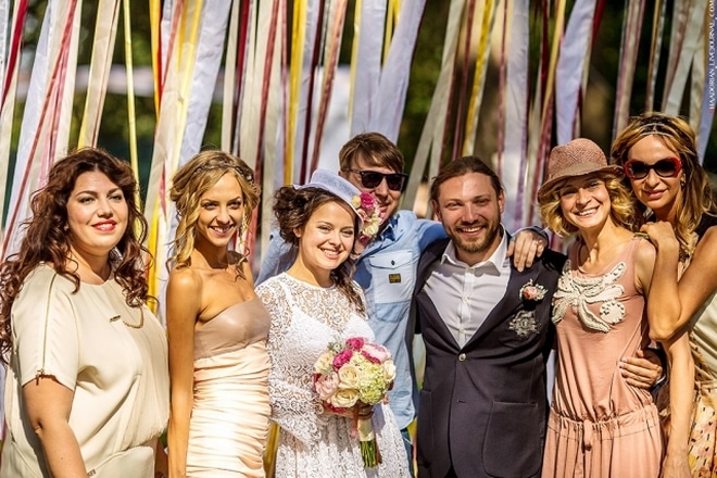Впрочем, свадьба не стала шикарным светским событием. Торжество проходило 1 июля на природе, под открытым небом, на берегу реки. Договориться о проведении общественного мероприятия оказалось не так легко. Местная администрация пошла навстречу молодым, согласовав торжество, когда узнала, что живописное место необходимо для предстоящих съемок.