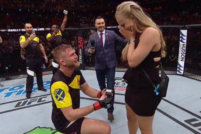 Спустя всего несколько недель после этого радостного известия у шведа состоялся долгожданный бой с Гловером Тейшейрой, который он выиграл, одолев соперника нокаутом. По окончании схватки Александр пригласил в октагон девушку и, встав на одно колено, под прицелами камер и взглядов тысяч зрителей сделал ей предложение. Моа не ожидала этого, она была растрогана поступком своего парня и ответила заветное «да».