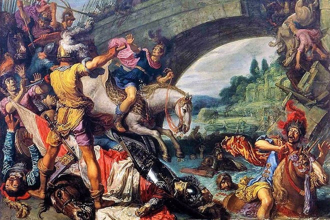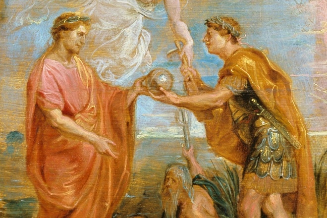 В 312 году Константин выдвинулся на бой в римском предместье возле Мульвийского моста, где, по легенде, увидел знамение своего предназначения – огненный крест в небесах. По другой версии, император увидел вещий сон, в котором ему велели поместить на щиты воинов монограмму из первых букв имени Христа. Так или иначе, бой был выигран, а после победы на императорском знамени – лабаруме – появились означенные символы.