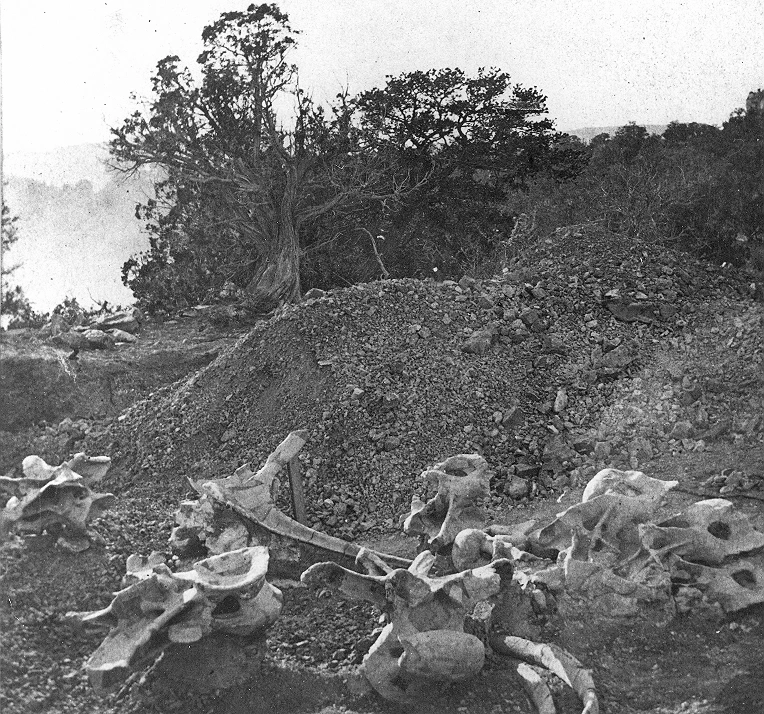 Гарден-парк – палеонтологический памятник в формации Моррисон. Место, где были найдены первые стегозавры. Здесь же протекает Четырехмильный ручей, возле которого школьники с Карлом Кесслером раскапывали скелет. Осадочные породы парка состоят из глины и камней. Поэтому в том, что дети откопали ящера, нет ничего странного. На фото ниже представлено то, как это выглядит на местности. Фотография сделана Орамелем Лукасом в 1877 году. Кости принадлежат камаразавру (Camarasaurus supremus).