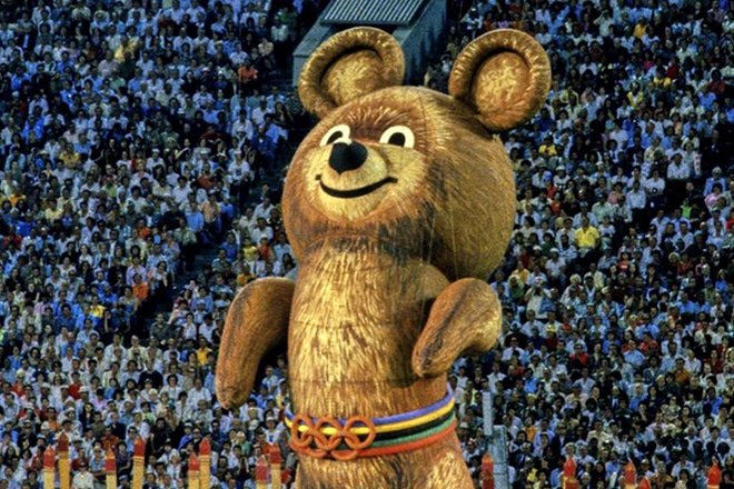 - Мишка, взлетающий над олимпийской ареной в Москве.