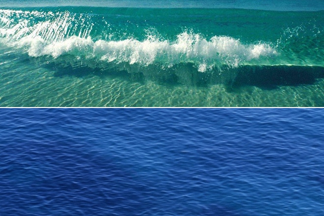 Вода в океане синяя благодаря рассеиванию света. Голубой цвет возникает вследствие поглощения красной части спектра. Истинный цвет воды можно увидеть, глядя на белый свет через трубу с водой, закрытую с двух концов прозрачными стеклами.