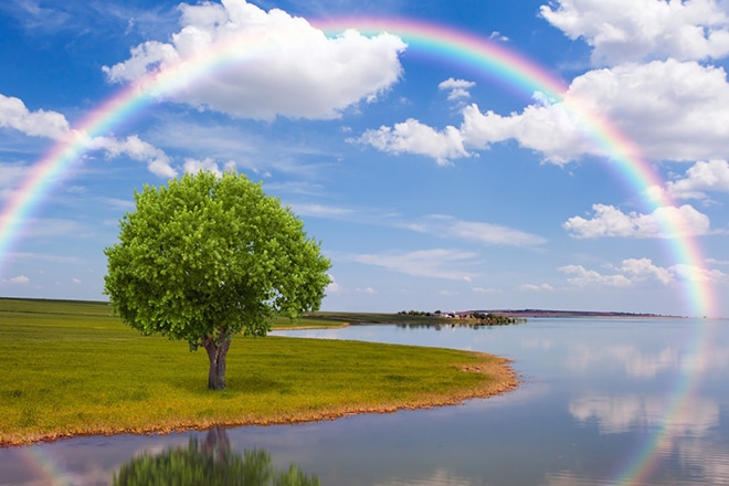 Дуга в виде полуокружности может появиться на небосклоне лишь утром и вечером. Лучи отражаются в мельчайших каплях, которые остаются в атмосфере после дождя. Так как поверхность капелек выпуклая, проходящий через них солнечный свет преломляется, и мы видим радугу.