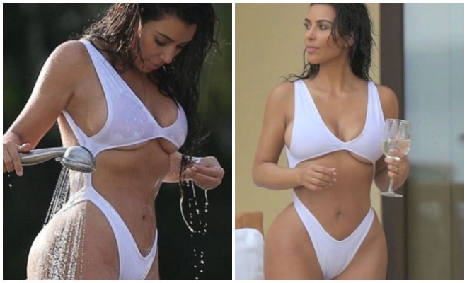 Некоторые стали считать Ким Кардашьян полной после того, как в Сеть просочились ее снимки без “фотошопа”, но она не стыдится своей фигуры и любит демонстрировать ее окружающим. Буквально легендарным стал ее белый купальник, открывающий сразу все выдающиеся части тела: грудь, пресс, ягодицы и спину.