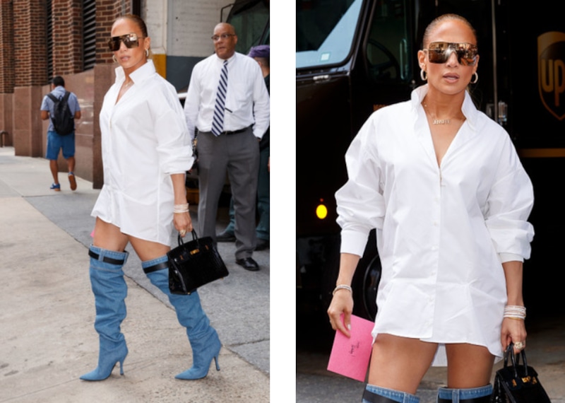 Поп-певица Дженнифер Лопес пришла на шоу в Нью-Йорке в мужской белой рубашке и джинсовых ботфортах. Папарацци успели заснять американскую артистку в весьма неудачном образе.