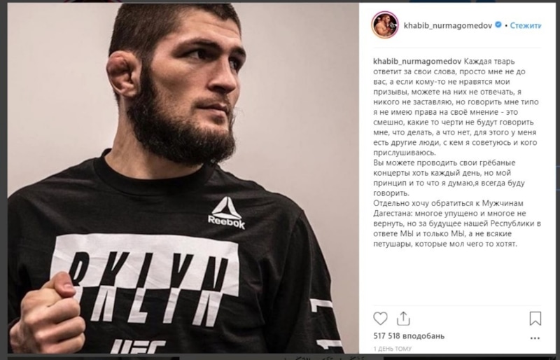 В начале сентября он спровоцировал бойкот концерта Егора Крида в Махачкале. Дагестанцы стали угрожать расправой российскому певцу, если тот приедет в республику. В итоге Крид отменил шоу, после чего указал Хабибу на то, что он не вправе решать, какие песни должны слушать его соотечественники. Позже Егора в «Инстаграме» поддержал Тимати.