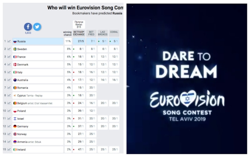 Самые большие шансы (11%) у представителя России, хотя его имя, как и имена многих других участников, неизвестно. Во многом высокий коэффициент российского исполнителя связан с последними слухами о том, что РФ представит Сергей Лазарев. Бронзовый призер «Евровидения-2016» полюбился западным слушателям благодаря песне You Are The Only One.