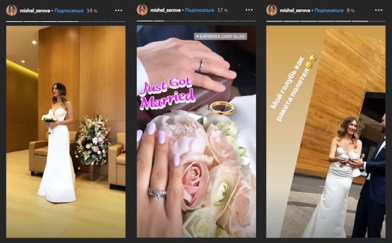 На своей странице в «Инстаграме» Мишель выложила несколько кадров в разделе «истории», на которых она предстает в белоснежном платье. Невеста показала себя во всей красе, а жениха удалось увидеть лишь мельком. Вопреки слухам, он мало похож на ведущего Дмитрия Борисова. На видео с запуском голубей в небо видно, что избранник Мишель является обладателем массивного овала лица, короткой стрижки и бороды.