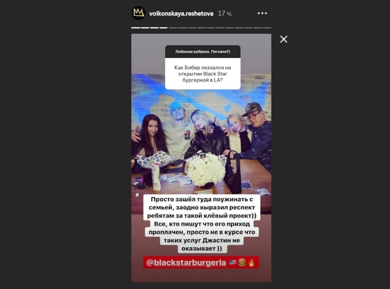 Отвечая на вопросы подписчиков в сторис «Инстаграма», избранница Тимати вступилась за отца своего ребенка. Анастасия заявила, что Джастину просто захотелось устроить семейный ужин и он по собственному желанию выбрал заведение российского рэпера. При этом Решетова подчеркнула, что Бибер «выразил респект» владельцам и сотрудникам.
