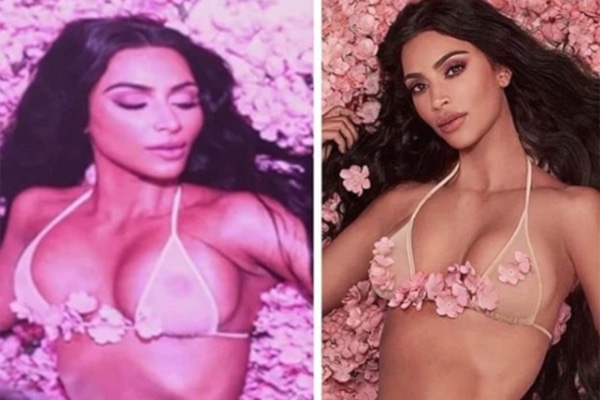 Разоблачители представили коллаж из двух снимков. На фото справа Ким Кардашян позирует в бикини телесного цвета среди цветов лицом к камере. Этот кадр, по информации администраторов аккаунта, уже прошел «процедуру» фотошопа. А вот снимок слева — это фотография, сделанная с монитора компьютера, на котором обрабатывались снимки Кардашян во время той самой фотосессии.