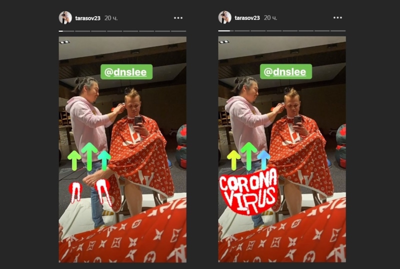 В сторис «Инстаграма» муж недавно родившей второго ребенка Анастасии Костенко выложил селфи, сделанное в парикмахерской. В подписи к снимку Тарасов написал имя барбера, а также подшутил над его национальностью. На трудящегося над прической футболиста Дениса Ли с помощью стрелок указывает анимированная надпись «коронавирус» на английском языке.