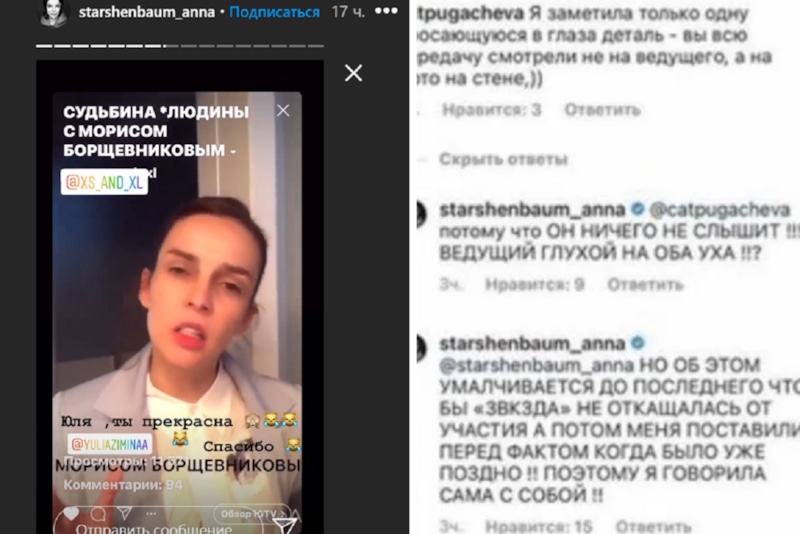 Так, в сторис Анна разместила фрагмент видео юмористического дуэта XS/XL, который несколько месяцев назад снял пародию на проект Корчевникова. В ответе на комментарий одной из подписчиц Старшенбаум высмеяла то, что у Бориса проблемы со слухом, поэтому, давая ему интервью, она будто разговаривала сама с собой.