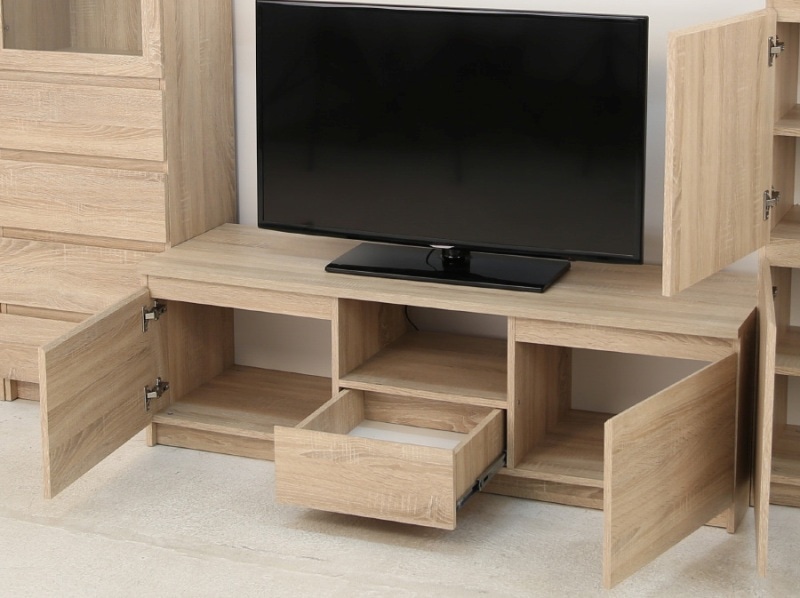 В тумбе под телевизор важен его размер. Это на тот случай, если у вас уже имеется телевизор. Если же вы определяетесь с выбором и того, и другого, присмотритесь к моделям поочередно. «Столешница» ни в коем случае не должна прятаться под опорой ножкой телевизора. При малой площади тумбы вся конструкция завалится, не выдержав неправильного распределения нагрузки сверху. В идеале, свободные участки верхней части ТВ-тумбочки должна иметь по краям не менее 5 см от основания телевизора.