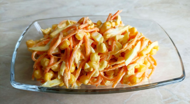 Сыр нарезают на куски длиной 3-4 см, разбирают на волокна и пересыпают в миску. Туда же кладут яйца, кукурузу без жидкости и корейскую морковку. Все тщательно перемешивают. Соль не добавляют, ибо сыр и так ее содержит, равно как и морковь.
