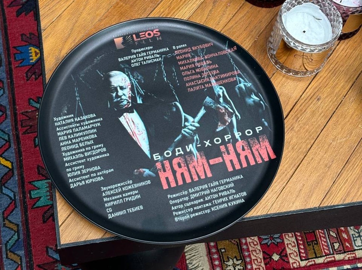 Режиссёр уже продает декорации со съёмочной площадки — разбитые тарелки с кровавыми следами по 10 тысяч рублей за штуку. Это уже не просто кино, а целое событие.