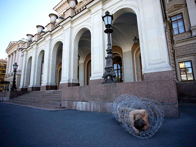 Почти через год Павленский разделся и обернулся колючей проволокой около здания заксобрания Санкт-Петербурга. Так он пролежал 20 минут, после этого полицейские разрезали проволоку, и Павленского отнесли в здание. Другая акция прошла в Москве: художник прибил мошонку к брусчатке на Красной площади. Перфоманс был приурочен ко Дню полиции.
