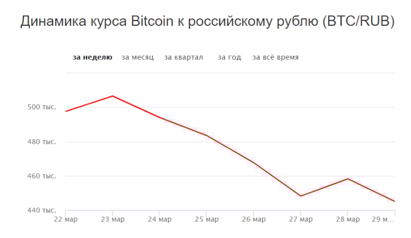 Курс биткоина к рублю, по данным «Яндекс.Новостей», составляет 445 тыс. руб. За день цена валюты упала на 13 тыс. руб.