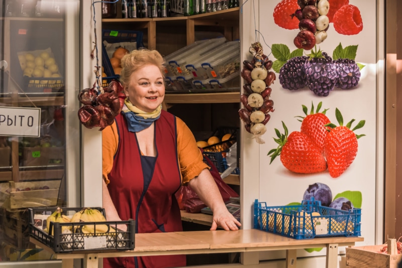 Одежда накладывает опечаток на внешность персонажа и его восприятие зрителем. Тамара – среднестатистическая горожанка. Ей около 50 лет. Она собирает волосы в пучок на затылке. В сочетании с полнотой ее героиня становится продавцом, легко помещаемым в любой временной промежуток от 1930-х до 2024 года.
